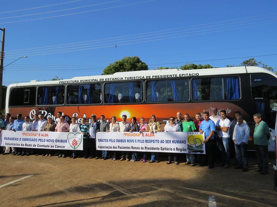 Cumprindo compromisso de campanha (Humanizar a Saúde), o prefeito Sidnei Caio da Silva Junqueira, o “Picucha” (PSB), adquiriu ônibus novo para atender pacientes que fazem tratamento na cidade de Jaú, também aqueles que se submetem à sessões de hemodiálise em Presidente Prudente. O coletivo, zero quilômetro, dotado de ar condicionado, cambio automático e outros dispositivos de conforto, chegou a Epitácio dia 15 e foi recebido no paço municipal com agradecimentos feitos pelas entidades que representam os usuários. Recorde-se que, “Picucha” e Alda, foram viajar com os pacientes para Jaú e sentir, na pele, o que eles enfrentam durante o percurso. Então, pensando no conforto dos pacientes, os administradores, recorreram a denominada verba de Compensação Ambiental, e compraram o ônibus. A secretária municipal de Saúde, Fabiana Guimaro Paulo, recebeu o veículo e já está providenciando a documentação do mesmo bem como contratação de seguro. Em breve o novo ônibus estará pronto para sua viagem inaugural, transportando aqueles que mais precisam da atenção do poder público.